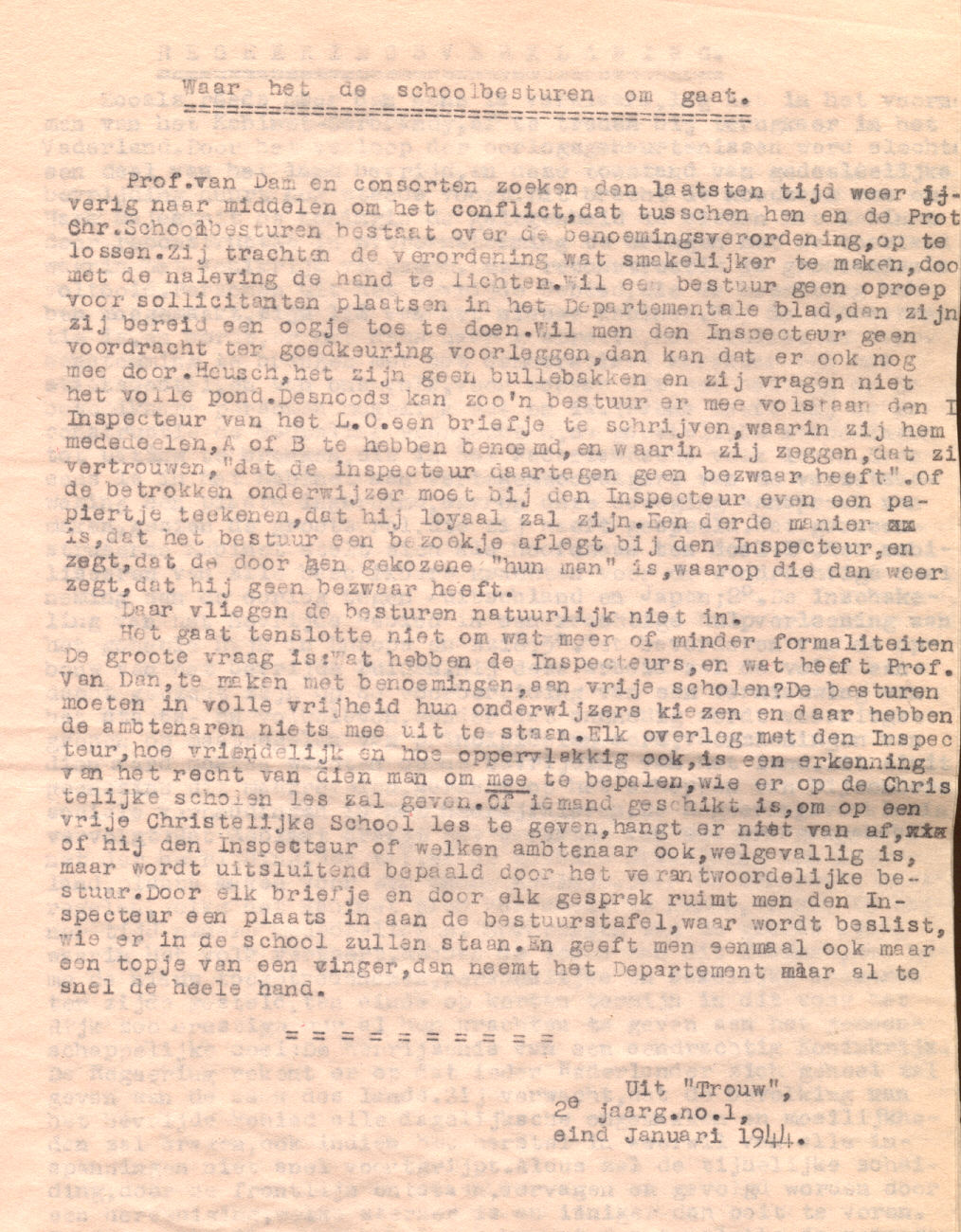 | dc.description | Out of the newspaper "Trouw" 2nd year no 1, January 1944. Original size 285mmX225mm on pink paper. Scanned on HP5300C scanner at 150dpi. 1 page. | en_US |