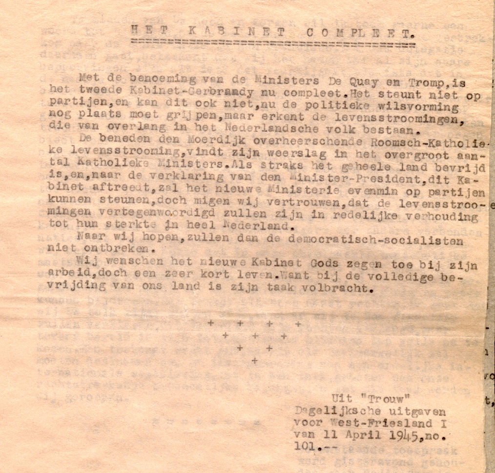 Out of the newspaper "Trouw" daily edition for West-Friesland, 11 April 1945, no 101