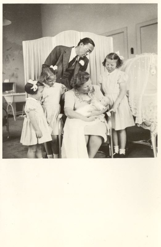 Postcard with Juliana, Bernhard, Beatrix, Irene, Magriet and Marijke (Later she was called Christina) at the birth of Marijke