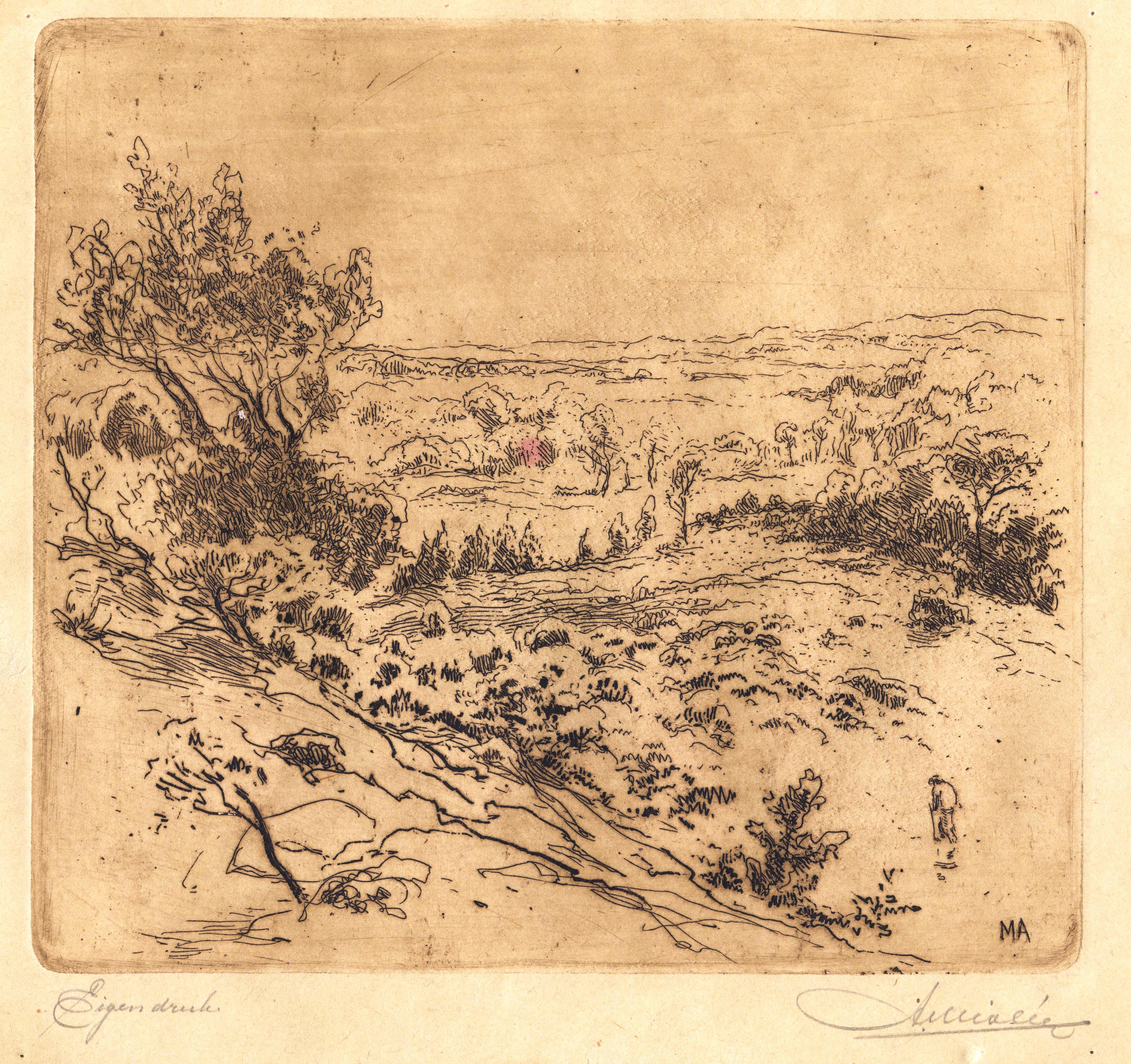 A dry needle etching of a man walking in the dunes at Koningshof, a national dune nature area in the Netherlands, monogram "MA" printed and "Eigendruk" inscribed in pencil.