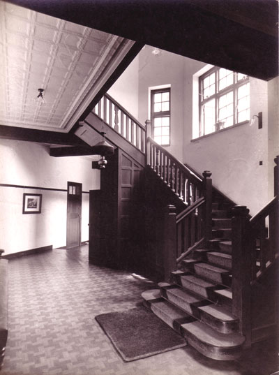 From the Pearse Collection: photograph depicting a soaring wooden staircase. The interior has Arts and Crafts as well as Victorian characteristics. The spandrel framing consists of wood panelling. The ceiling appears to be of either pressed steel or wood, and the floor could be of encaustic tiles. Photograph probably considered for prof. Geoffrey Pearse's book "Eighteenth Century Architecture in South Africa", but never included.