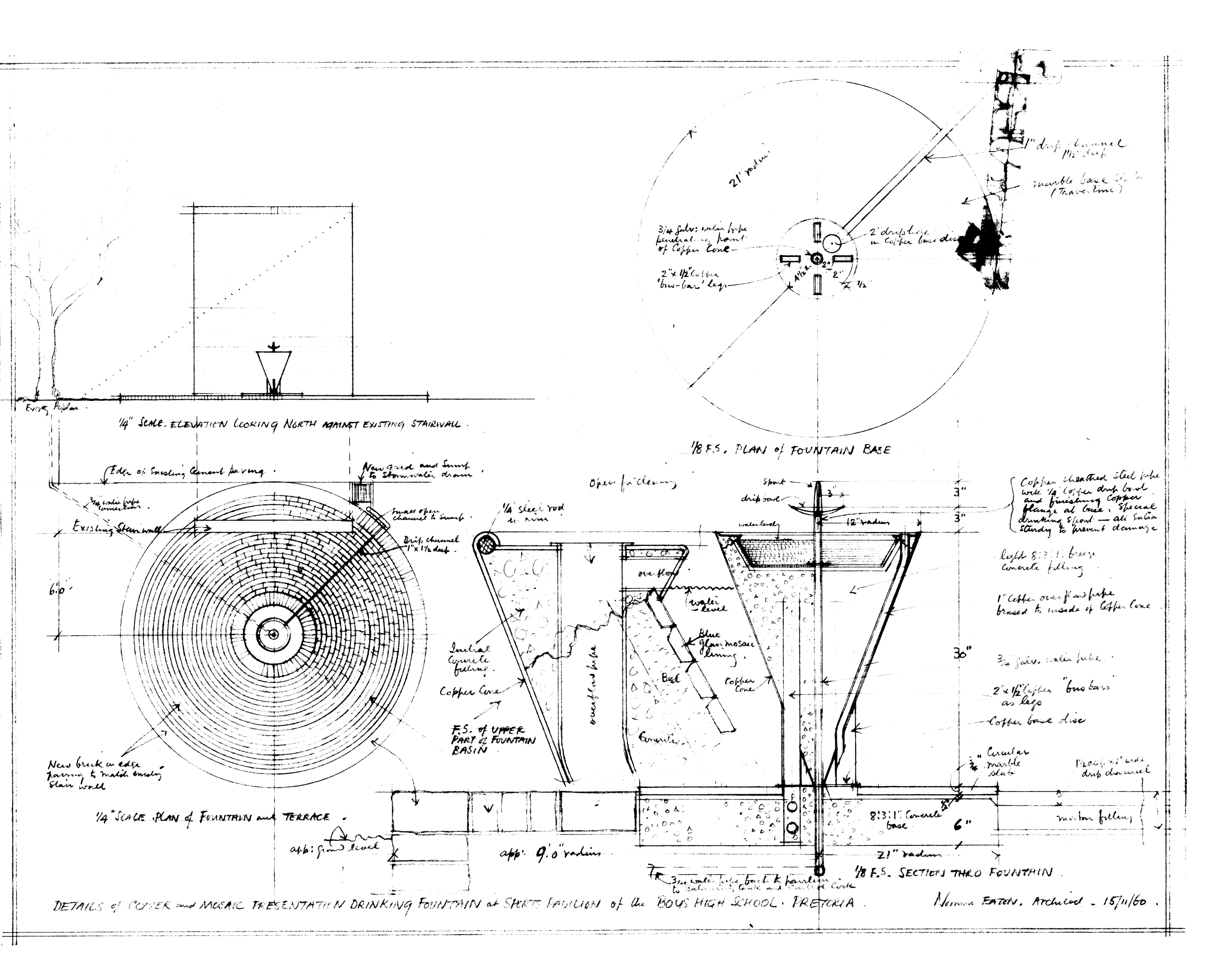 Plan and drawings numbered 07917-1s, 07917-3s, and 07919-1s of a drinking fountain at the sports pavilion, Boys High School, Pretoria.