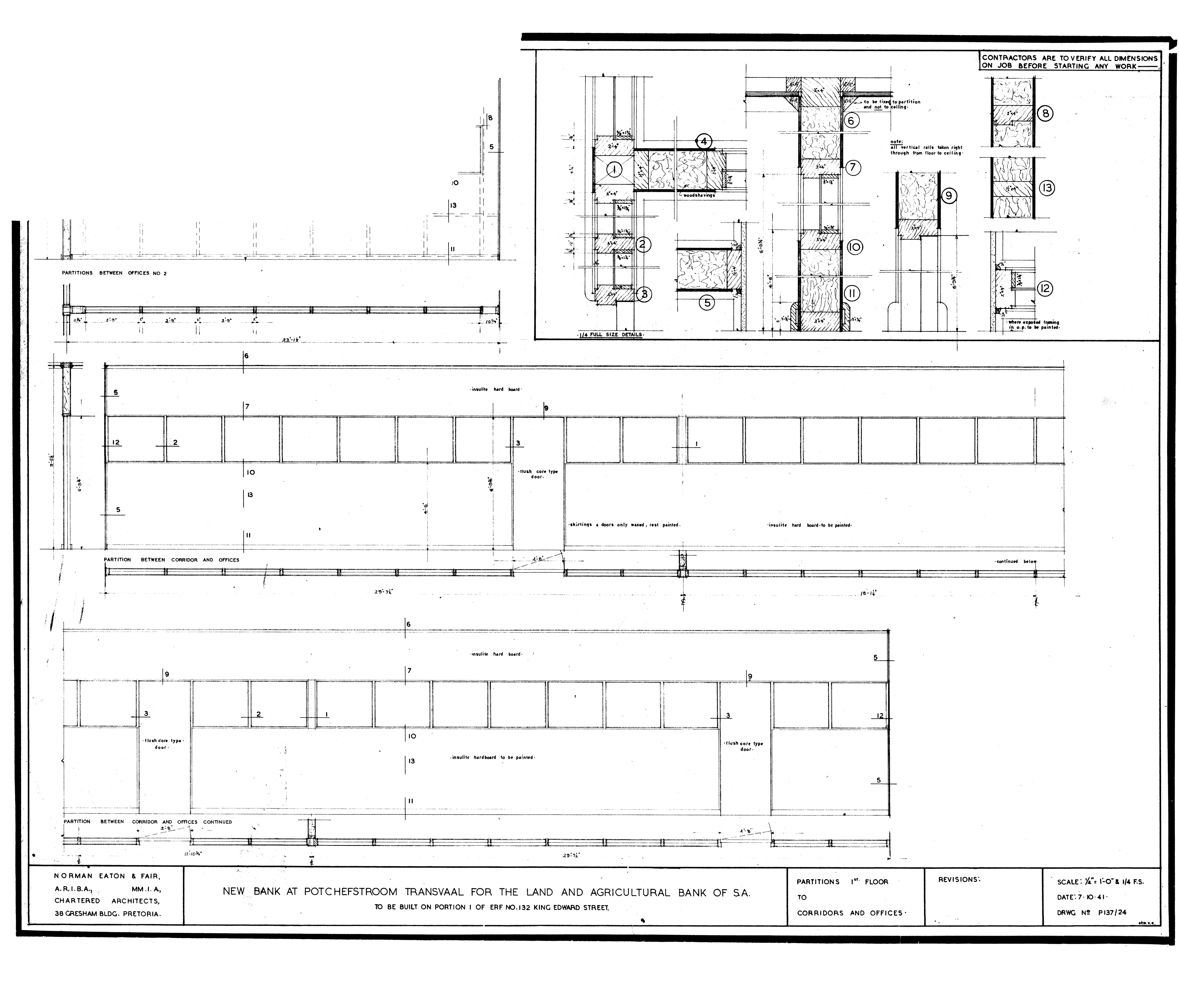 5 plans numbered 07080-01 to 07080-04 of the new building for the Land and Agricultural Bank of S.A. in Potchefstroom
