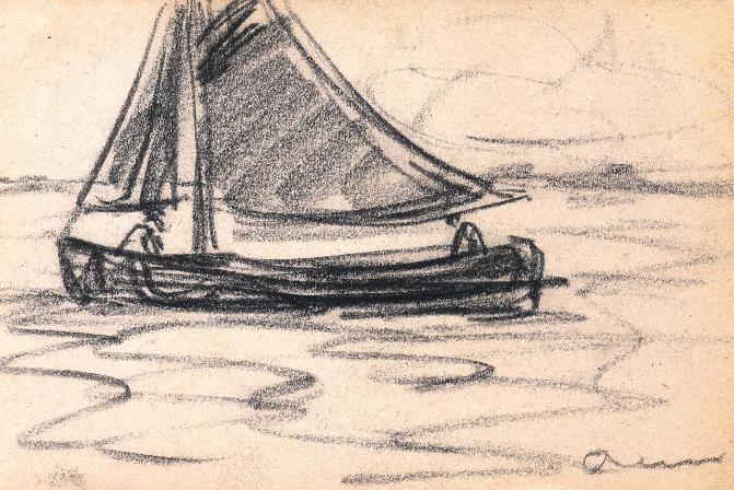 Charcoal drawing of a sail boat with two figures, signed bottom right.