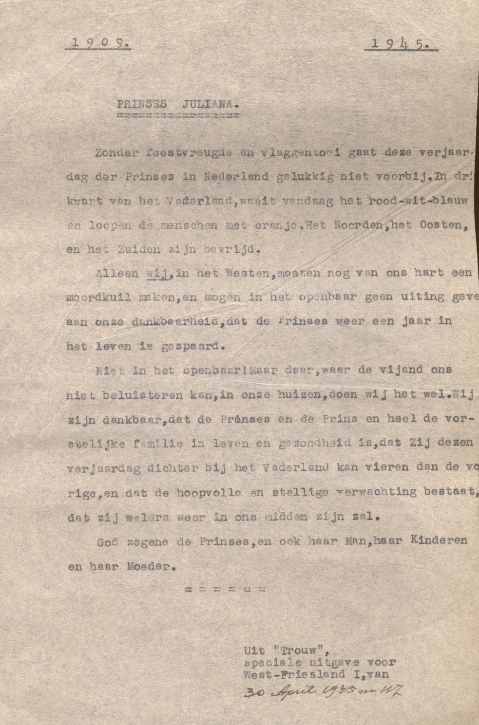 | dc.description | Out of the newspaper "Trouw" special edition for West-Friesland, 30 April 1945 no 112. Date and edition number written in pen. Original size 285mmX225mm on pink paper. Scanned on HP5300C scanner at 150dpi. 1 page. | en_US |