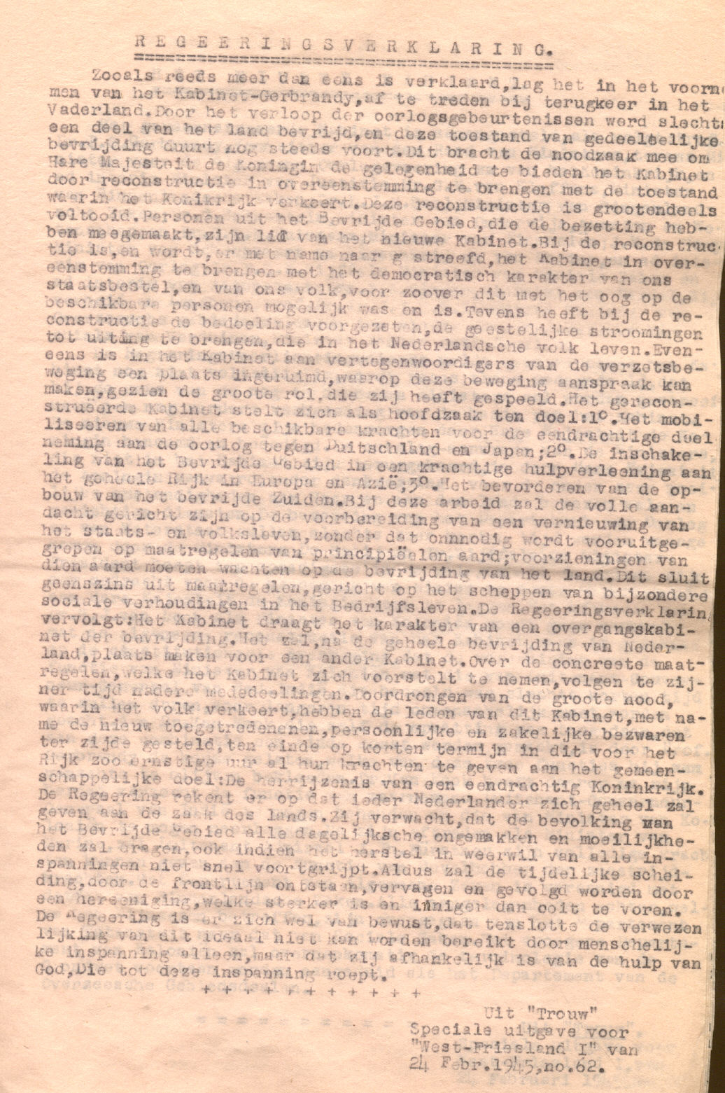 Out of the newspaper "Trouw" special edition for West-Friesland, 24 February 1945, no 62. Original size 285mmX225mm on pink paper. Scanned on HP5300C scanner at 150dpi. 1 page.