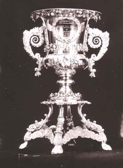 From the Pearse Collection: photograph depicting the elaborately decorated silver Fairbairn Cup. Cups like these were only made at the Cape during the 2nd quarter of the 19th century, but the one depicted is probably of a later date and may be European. An enscription is placed within an applied laurel cartouche. The body has applied vine leaves, and the handles are scrolled. The whole is placed on a four-legged stand, encrusted with what appears to be rocaille decoration.