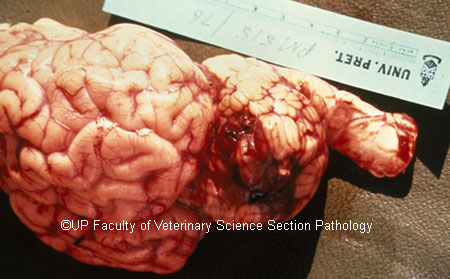 Turning sickness or cerebral theileriosis is an uncommon aberrant form of infection by Theileria parva or Theileria taurotragi in which lymphoblasts parasitized by schizonts accumulate in cerebral vessels leading to thrombosis and infarction. In the more acute form areas of intense congestion and haemorrhage are present in the meninges and brain which are associated with ares of softening (Infarction) and discoloration of brain tissue. Thrombosed meningeal vessels are often very promiment. There may be severe haemorrhage into the ventricles.