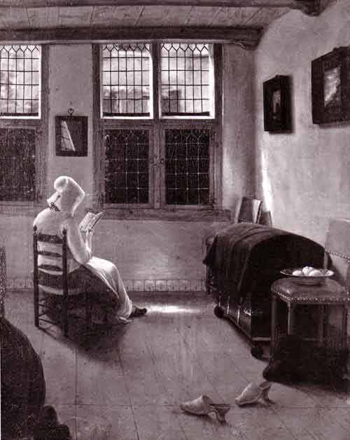 From the Pearse Collection: "Interior" by Pieter Janssens Elinga, showing a typical Dutch interior with a woman sitting in a chair reading. The floor and ceiling are both of wooden boards; two leather-covered chairs flank a large kist. A pair of shoes can be seen in the foreground.
