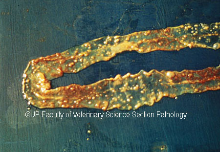 | dc.description.abstract | The photo shows a severe infection of the small intestine of a goat. Each of the white foci contains numerous Eimeria parasites in various stages of the developmental cycle. | en_US |