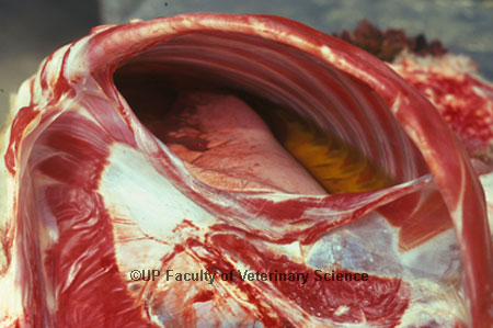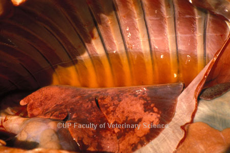 After being bitten by an infected tick E. ruminantium enters the animal in the saliva of the tick. Initial multiplication of the parasiteprobably takes place in cells of the lymph node regional to the tick bite from where it enters the blood stream and invades endothelial cells in various tissues and organs. Increased vascular permeability resuylts in transudation of fluid into various body tissues (e.g. brain and lungs) and body cavities (e.g. pericardial and thoracic cavities), but the precise mechanisms responsible for the transudation are poorly understood. Pathology: the lesions in cattle, sheep and goats are similar, the most pronounced being often severe hydropericardium, hydrothorax and lung oedema with serofibrinous foam being present in the bronchi and trachea. These images illustrated a severe case. (Source: Allsopp, BA, Bezuidenhout, JD & Prozesky, L 2004, 'Heartwater', in Coetzer, JAW & Tustin, RC, Infectious diseases of livestock, Cape Town, Oxford University Press, 2004)