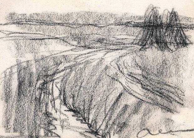 Charcoal drawing of a muddy road cutting through a wheat field, at the end of the road are two hay heaps. Signed the bottom right