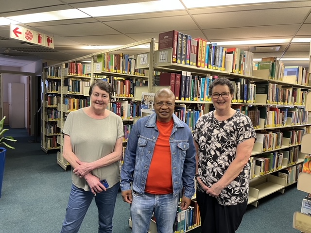 - Photo 5: Jean Duncan, Pat Thomson with the JF Soga Library manager Myleen Oosthuizen and Marguerite Nel