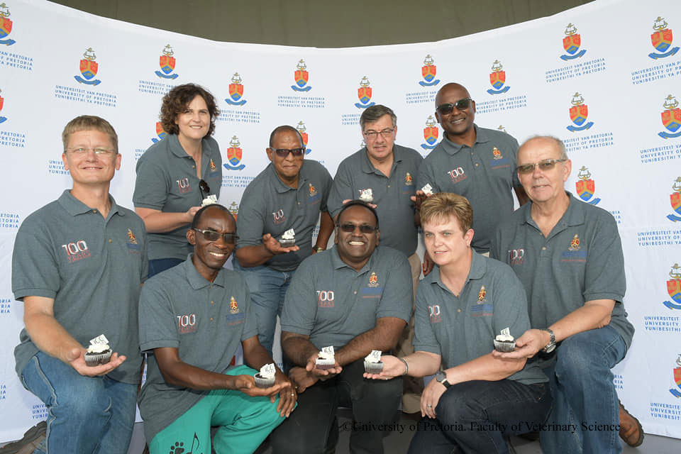 Group photo of the members of the Faculty's Executive Committee together with Prof Vinny Naidoo, Dean (front, middle). At the back are Prof Amelia Goddard, HOD: Companion Animal Clinical Studies; Prof Rebone Moerane, HOD: Production Animal Studies; Prof Christo Botha, HOD: Paraclinical Sciences and Prof Tshepo Matjila, HOD: Veterinary Tropical Diseases. In the front are from left to right: Prof Dietmar Holm, Deputy Dean: Teaching and Learning; Prof Joseph Chamunorwa, HOD: Anatomy and Physiology; Prof Naidoo, Prof Marinda Oosthuizen, Deputy Dean: Research and Postgraduate Studies, and Dr Paul van Dam, Director: Clinical Services (OVAH) and current Faculty Manager