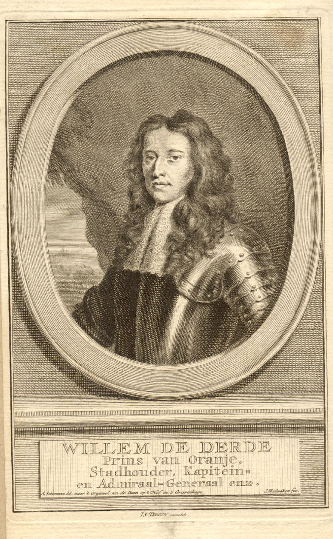 Copper engraving, oval portrait of Willem III. Inscribed "Willem de Derde Prins van Oranje, Stadhouder, kaptein en Admiraal-Generaal ens.". Signed "J Houbraken" and "A Schouman na't origineel van de Baan op 't Hof in s'Gravenhage".