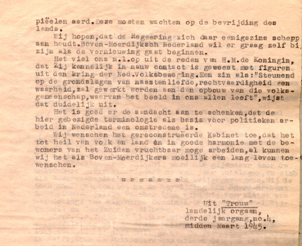 Out of the newspaper "Trouw" landelijk orgaan, third year no 4, March 1945. Original size 285mmX225mm on pink paper. Scanned on HP5300C scanner at 150dpi. 2 pages.